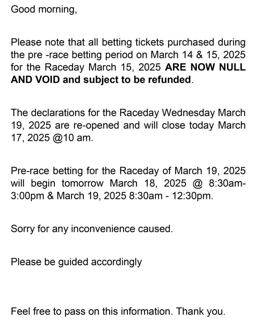 - Any & All claims of lost winning or refunded Pari-Mutuel tickets or vouchers will NOT be considered.